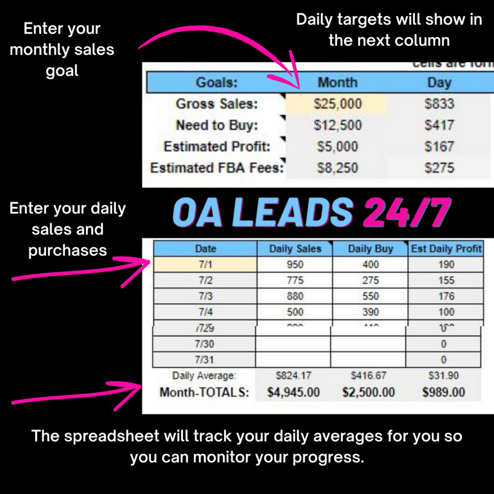 This spreadsheet will help you breakdown and track how much you've sold, how much you've bought and your estimated profit on a daily basis. Check the Daily Averages throughout the month to see if you're on pace to hit your goal!